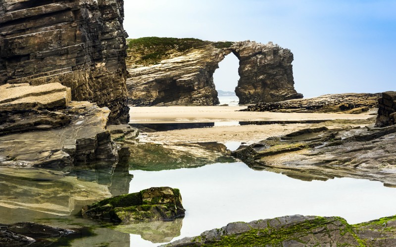 Het strand van Las Catedrales is een natuurmonument in de geomorfologische formatie die bekendstaat als de Cantabrische Vlakte. Dit strand ligt in de regio Mariña Lucense, in de parochie A Devesa, onderdeel van de gemeente Ribadeo, en is uitgegroeid tot een van de meest ongewone en opvallende stranden van het land. Het wilde water van de Cantabrische Zee beukt al miljoenen jaren op deze rotsen, voornamelijk leisteen en kwartsiet, en heeft verrassende vormen in de kliffen uitgehouwen. Er zijn lange gangen ontstaan, bedekt met fijn zand, diepe grotten met prachtige kleuren die veranderen afhankelijk van de stand van de zon, en grote bogen van meer dan 30 meter hoog, waar je bij eb onderdoor kunt lopen. Ook voor kinderen is het een ideale plek: als het eb is, ontstaan er allerlei kleine poelen met kristalhelder water, die opwarmen als de zon erop schijnt.