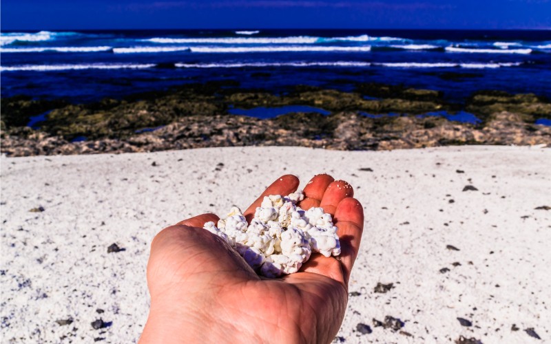 Op de noordpunt van Fuerteventura, tussen de steden Corralejo en Majanicho, ligt het strand Playa de las Palomitas, dat eigenlijk Bajo de la Burra heet. Het is een plek die op sociale media is uitgegroeid tot een van de beroemdste stranden van het eiland. Hier vind je geen fijn goudkleurig zand, maar een soort kiezelsteen die eigenlijk bestaat uit kalkalgen. Als ze door de vloed worden aangespoeld en afsterven, verliezen ze hun kleur en krijgen ze het karakteristieke popcorn-achtige uiterlijk. Ze worden rhodolieten genoemd en het duurt minstens 50 jaar voordat ze deze unieke vorm aannemen. De aantrekkingskracht van dit natuurschoon is zo groot dat veel bezoekers een souvenir meenemen, maar dit is ten strengste verboden omdat het een gevaar vormt voor de natuurlijke schat.