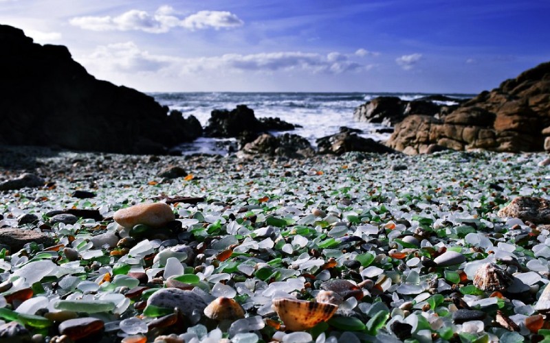 Jaren geleden werd deze hoek gebruikt als vuilstortplaats en gooiden bewoners glas in het water. Door de zee en erosie zijn de kristallen in de loop van de tijd gepolijst en naar de kust gesleept. Ze vormen nu bijna edelstenen die alles een kleur geven en voor iedereen die dichterbij komt een spectaculair kiekje opleveren. Het is echter verboden om stenen mee te nemen en zwemmen wordt afgeraden vanwege de sterke stroming.